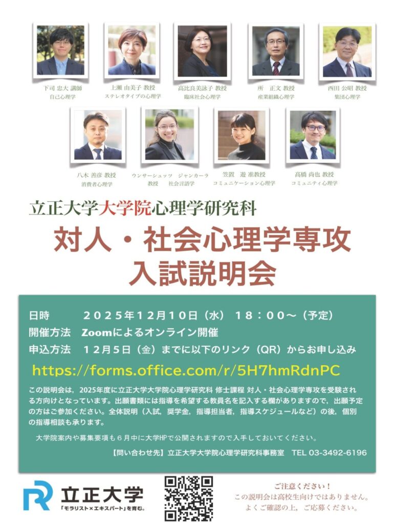2025年度 大学院修士課程対人・社会心理学専攻【オンライン型】入試説明会開催のお知らせ(12/10)