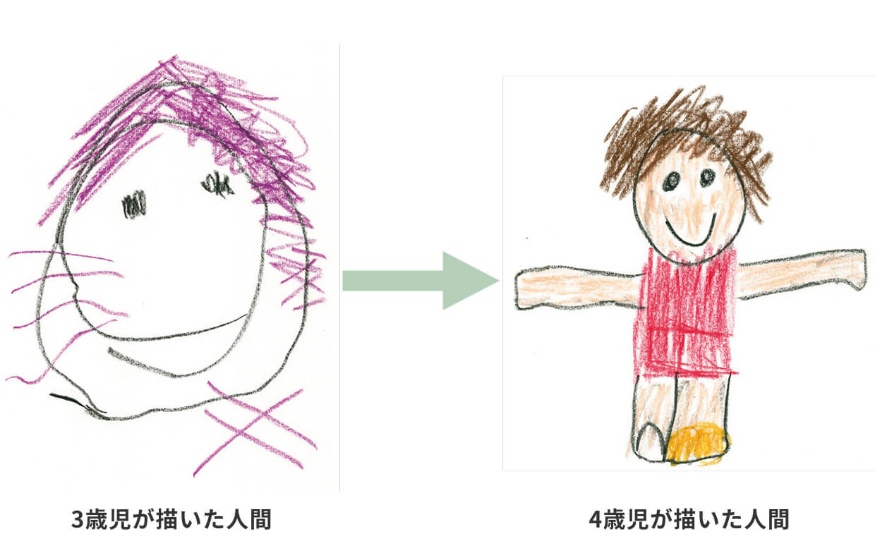 絵を描くという行為には、思い通りに手を動かすことができる身体的な機能の発達と、見えている世界を頭の中で思い描く認知的な機能の発達などが関連しています。そのため、発達に伴って子どもの絵は、ギザギザの線やグルグルした線などのなぐりがきから、しだいに形をもつものに変化していきます。