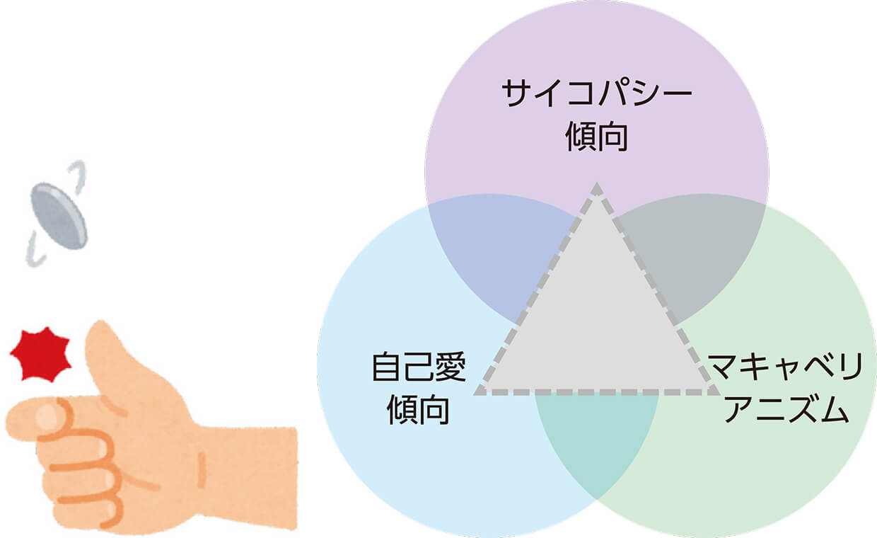 このような実験を行うと、多くのひとは正直に裏であったと申告します。しかし、なかには報酬のためにコインが表だったと嘘の申告をする人もいます。この嘘を申告するかどうかには「ダーク ・トライアド」と呼ばれる3つの性格特性が関わっていることが分かっています。マキャベリアニズムは戦略的で狡賢く、自己愛傾向は尊大で自己中心的、サイコパシー傾向は冷淡でスリルを求めるような特性を指します。これらの傾向にある人は他者に対する共感性が乏しいため、平気で嘘の申告をしてしまうのです。ダーク ・トライアドは嘘だけでなく、ネット荒らし、いじめ、ハラスメントなど、様々な反社会的行動と関係しています。